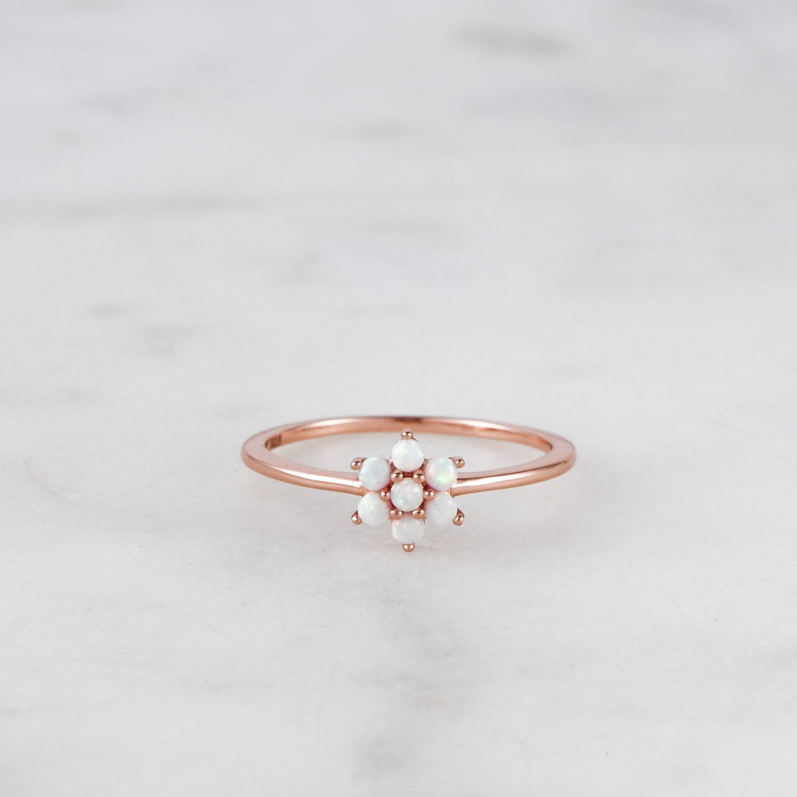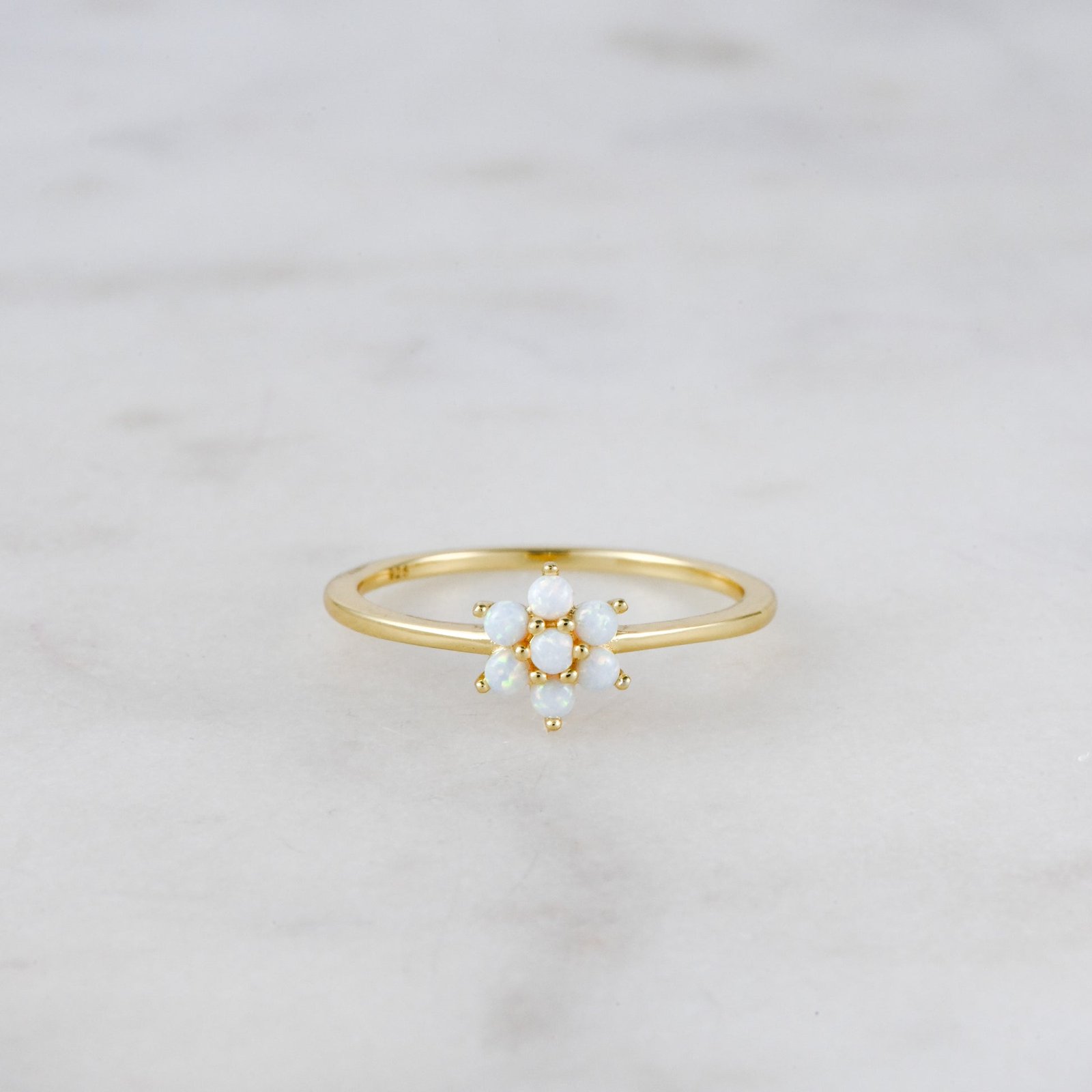 925 silver opal flower ring with a 7.5mm design and 1mm band. Thick 14k gold or rose gold plating, lab-created opal, hypoallergenic, and stackable.