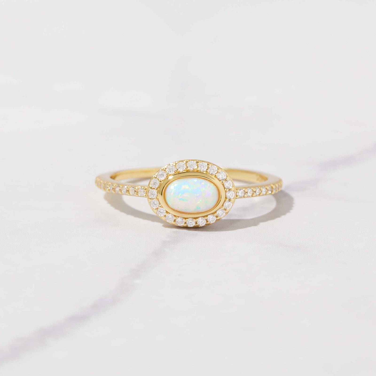 925 Silver Opal Halo Ring with 14K Gold or Rose Gold plating. Lab-created opal center with CZ halo. Nickel-free & hypoallergenic.