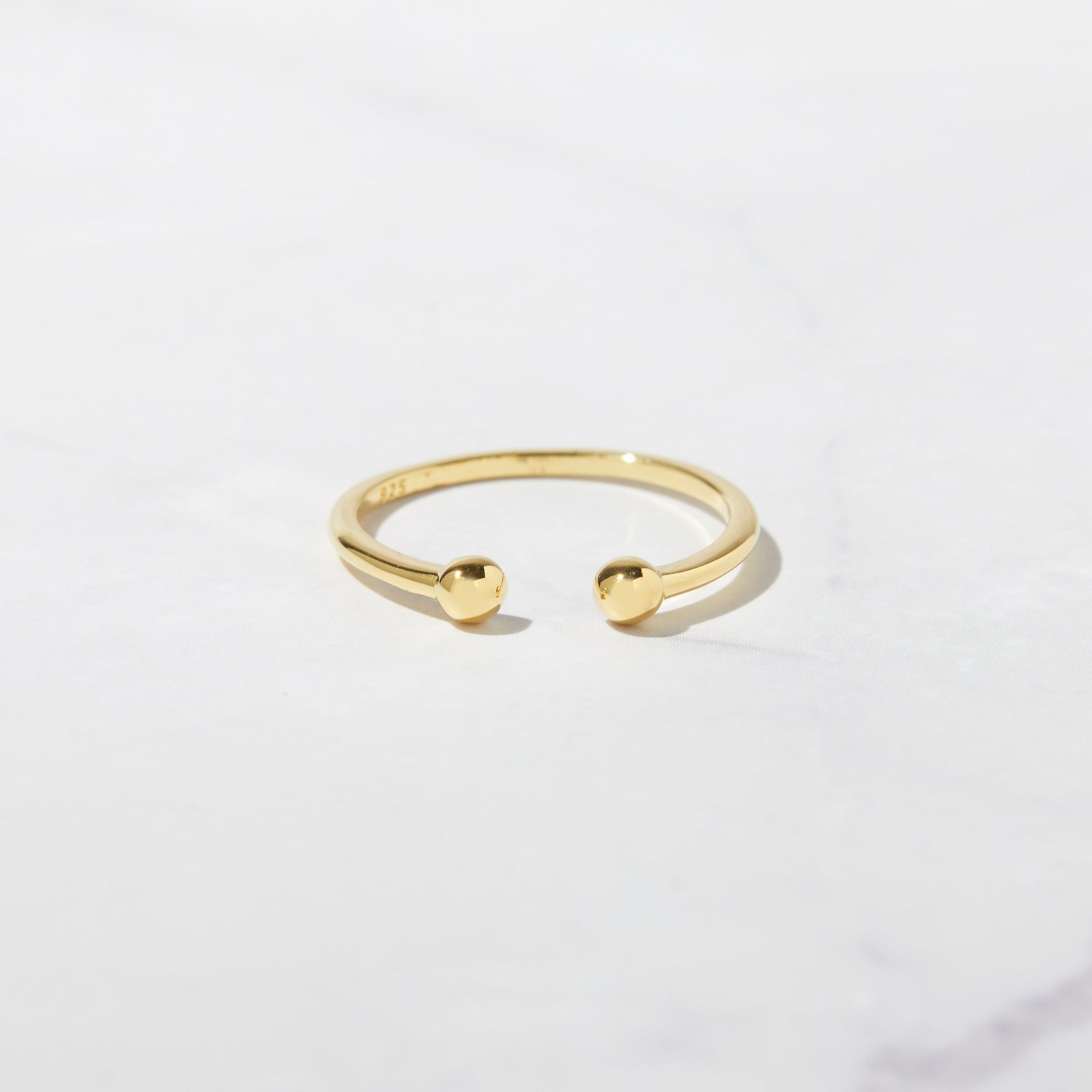 Dainty and adjustable open cuff ring in 925 sterling silver with polished ball ends. Finished with thick 14k gold plating. Perfect for stacking or solo wear.