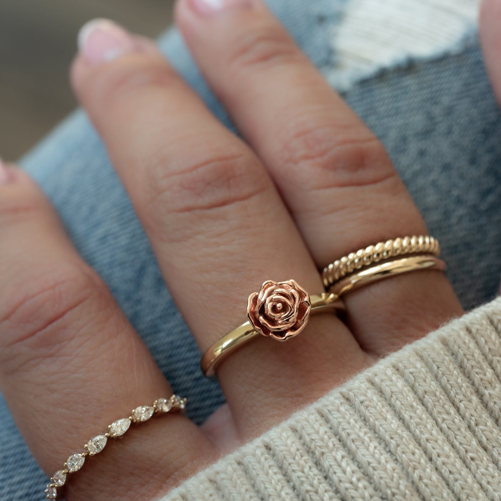 Nickel-free and hypoallergenic, the Rose Ring is gentle on sensitive skin and ideal for everyday wear. Whether worn solo or stacked with favorites like the Mia Ring, Pavé Signet Ring, or Rope Stacking Ring, it adds a meaningful and feminine touch to any jewelry collection.