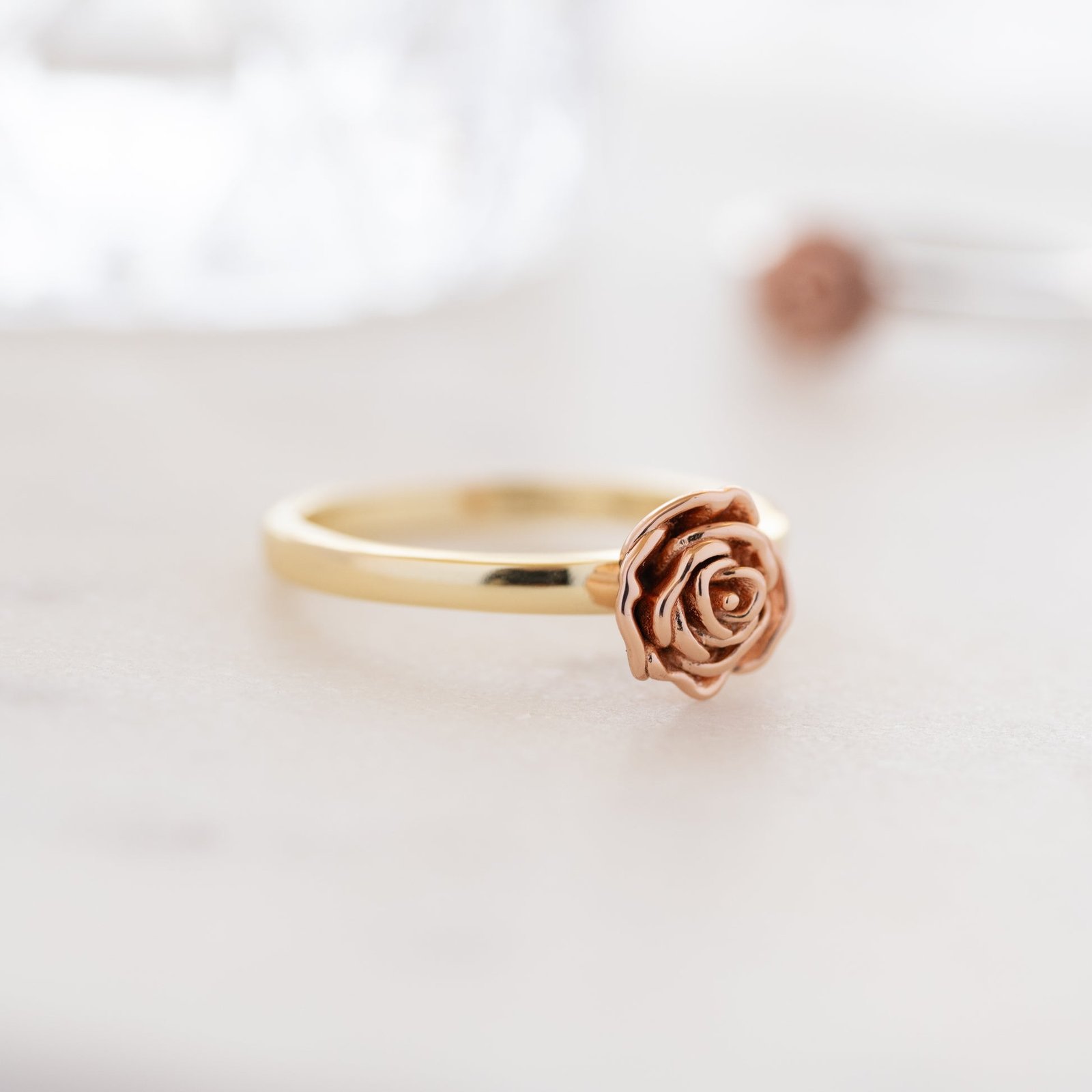 925 silver rose ring with a rose gold flower on a gold or silver band. Thick 14k plating, hypoallergenic, and designed to inspire everyday elegance.