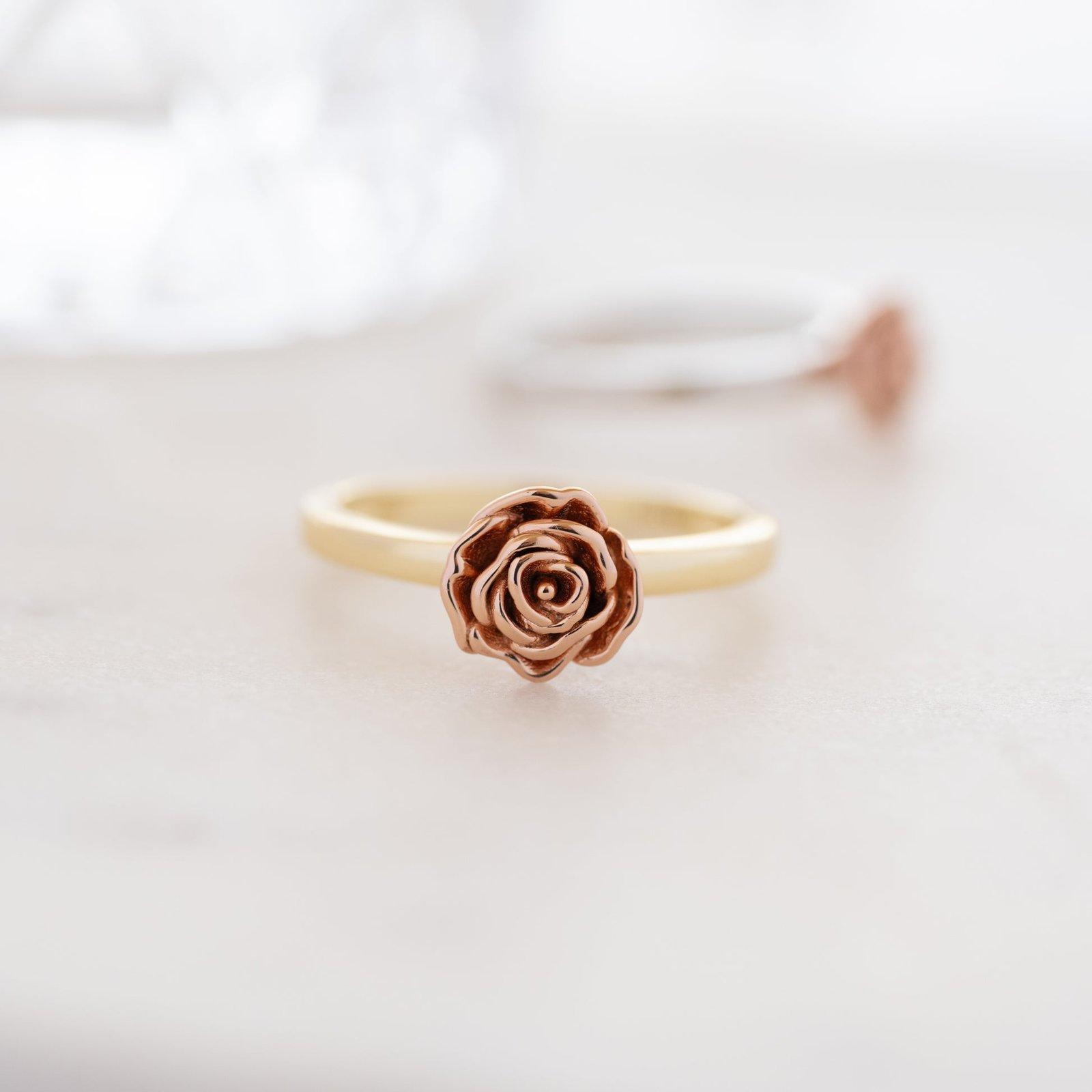 • A beautiful floral ring that is meant to inspire you to be your true authentic self! To “Be A Rose” and realize your own beauty and magic lies within you! Rose Gold flower set on a gold or silver band.