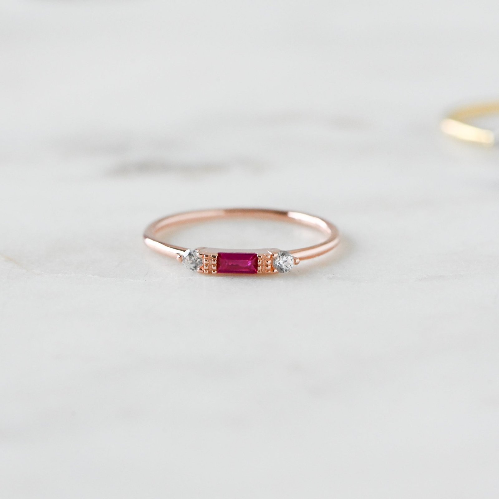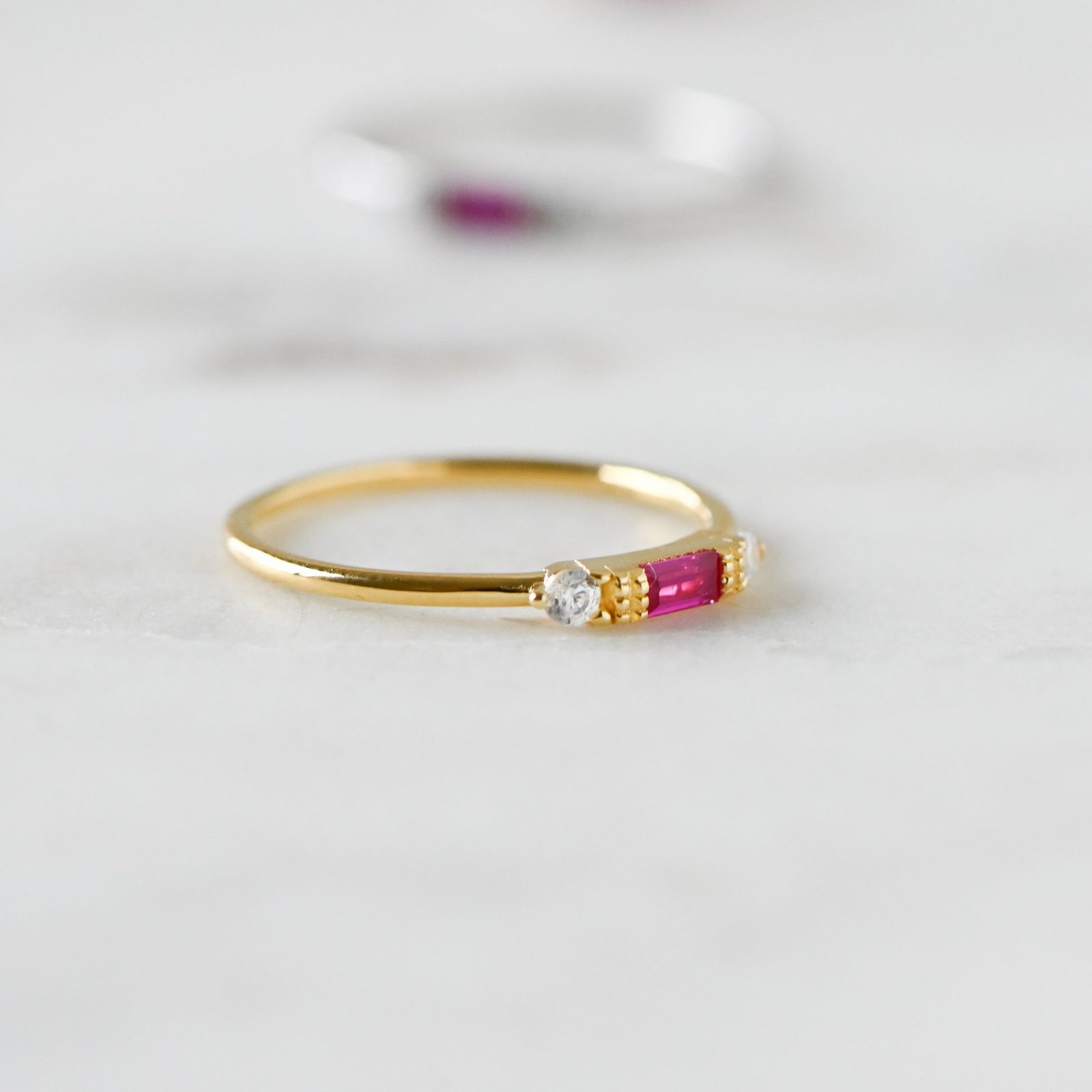 The ruby baguette stone at the center is surrounded by delicate cubic zirconia stones, designed to replicate the brilliance of a diamond. This ensures that the ring maintains a high-end look at an affordable price. The stones are the highest grade CZ, giving the piece a luxurious and authentic feel.