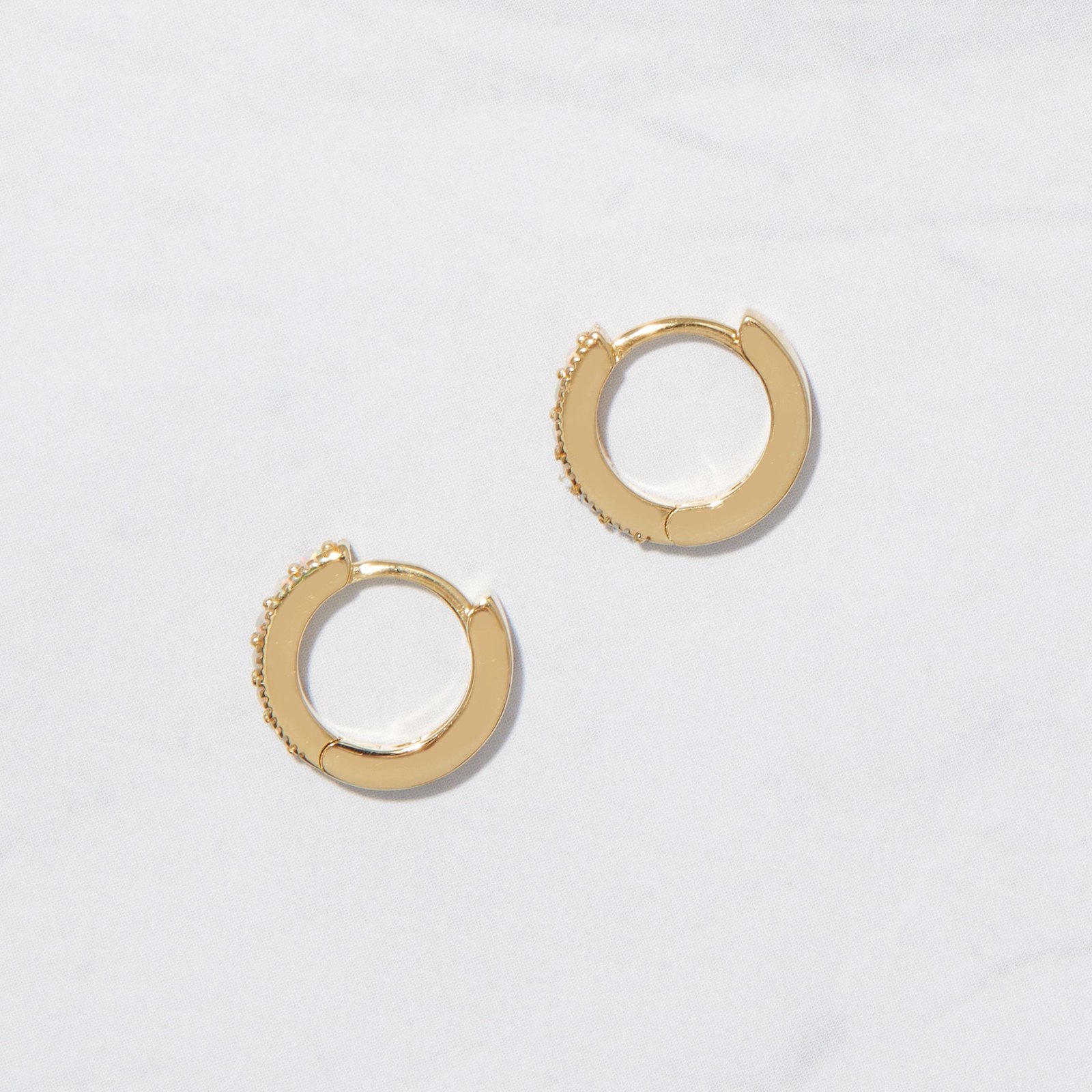 Cute opal huggies in 925 silver with 14k gold or rose gold plating. Lightweight, hypoallergenic, and perfect for everyday sparkle and stacking.