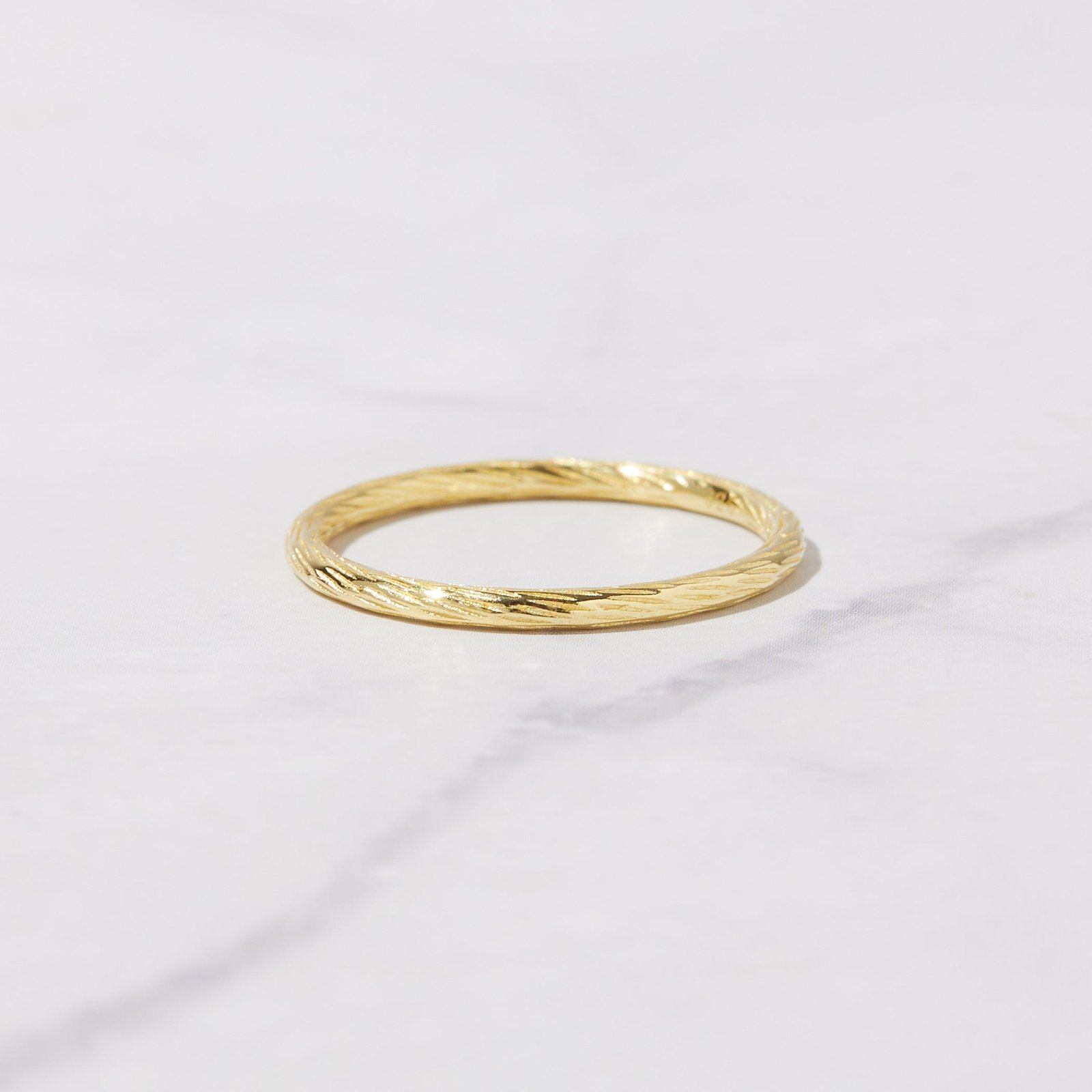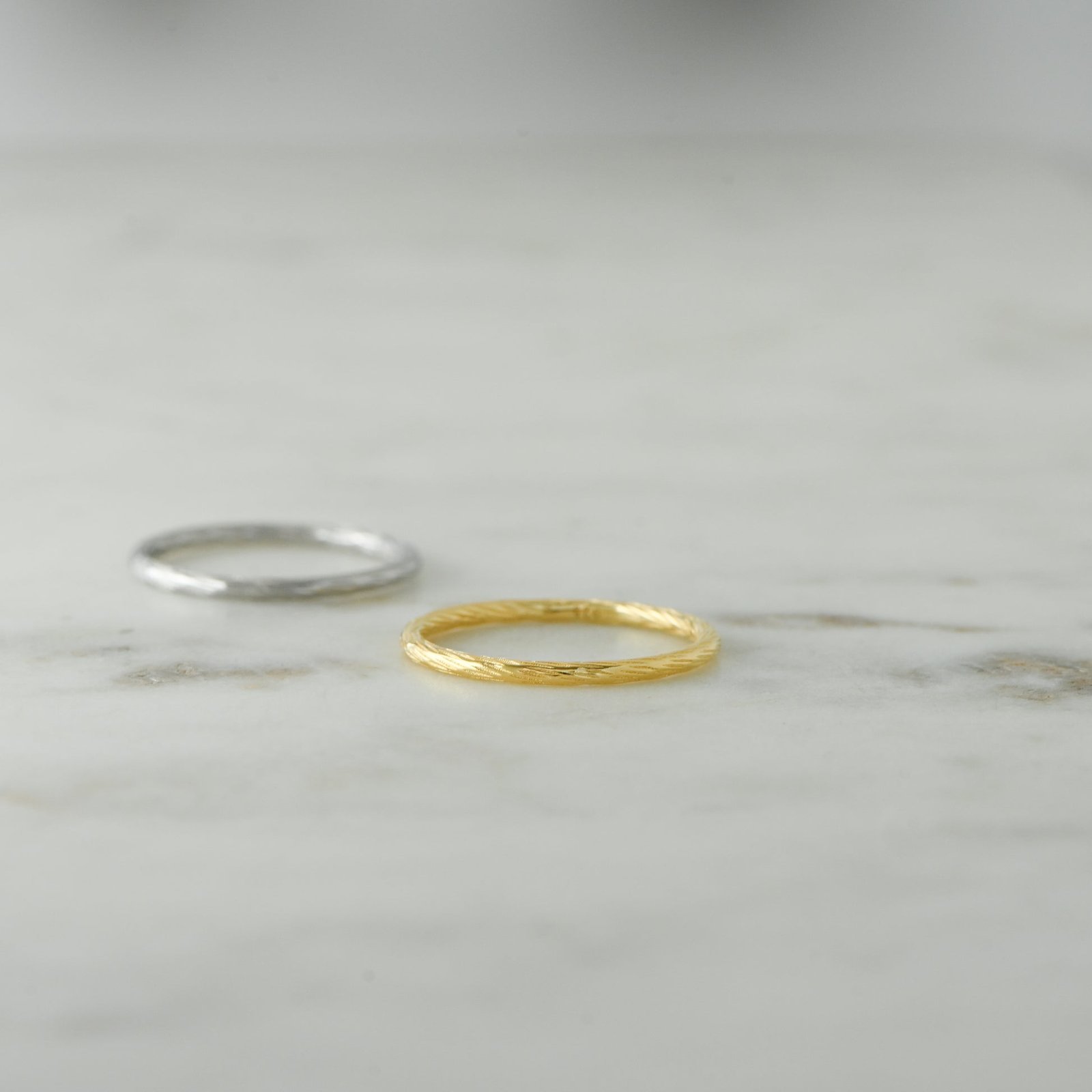 925 silver textured stacking band with thick 14k gold plating. Dainty 1.3mm design, hypoallergenic, and perfect for stacking or solo wear. Sizes 4–10.
