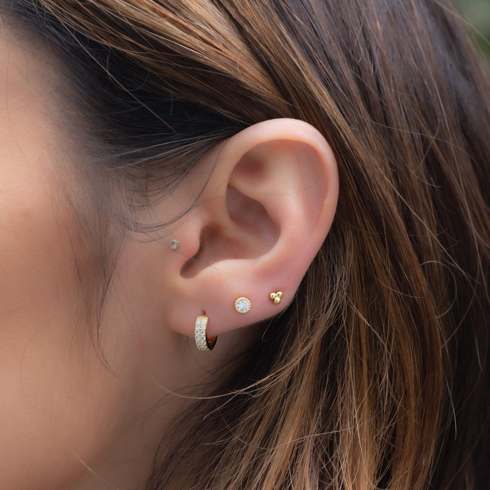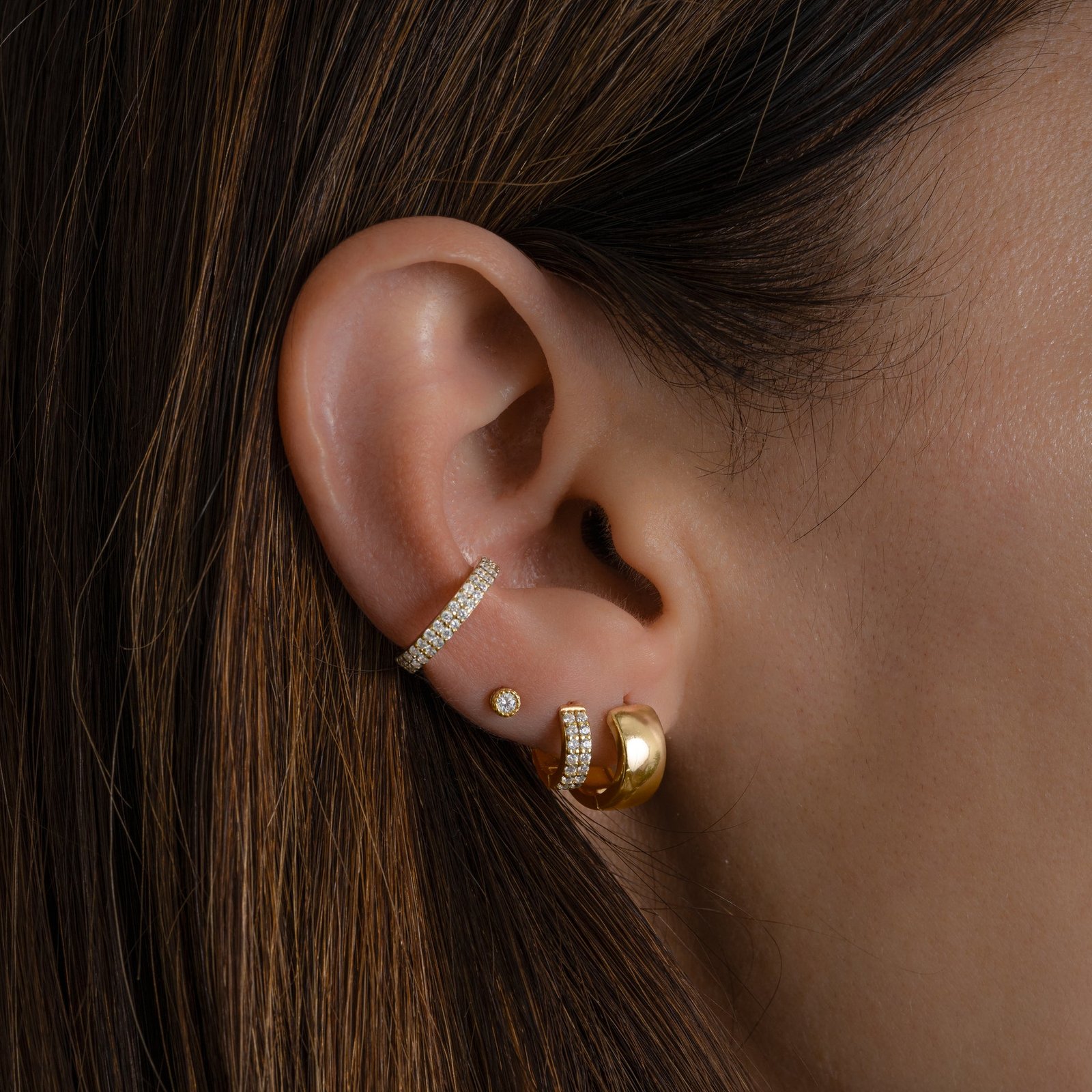 With an inner diameter of 7mm, outer diameter of 10mm, and 3mm thickness, they hug the earlobe just right for a snug and stylish fit. Lightweight, nickel-free, and hypoallergenic, they’re gentle on sensitive ears and perfect for all-day wear. Whether you’re pairing them with our Chunky Hoop Earrings, Diamond Studs, Croissant Ear Cuff, or Two Row Ear Cuff (as styled on the model), these huggies tie the look together with ease.