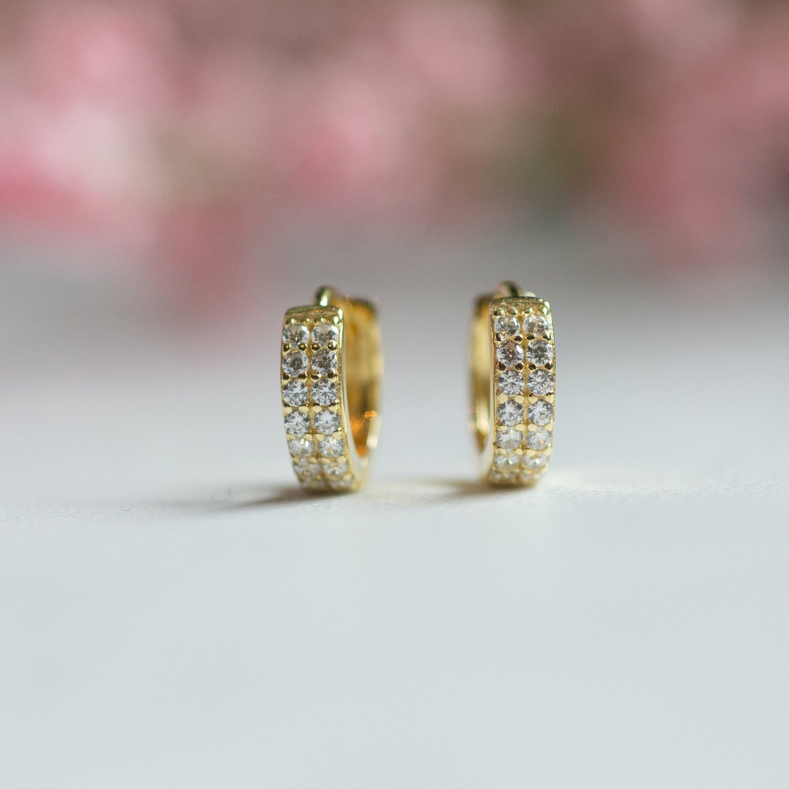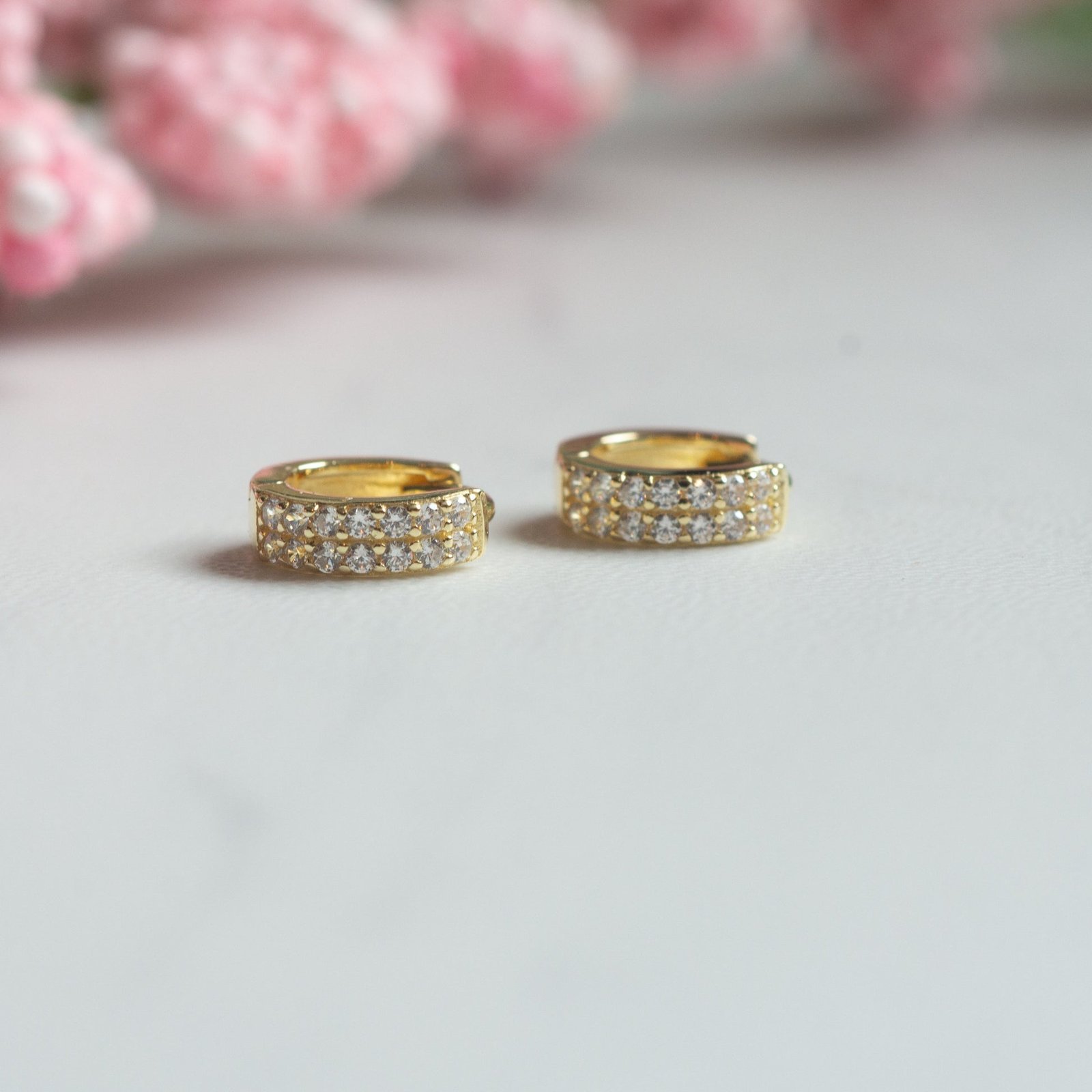 Expertly crafted from high-quality 925 sterling silver, each pair is finished with thick, durable 14K gold or rose gold plating for a luxurious, long-lasting shine. The dual-row design enhances the diamond-like brilliance of the CZ stones, giving these huggies a radiant sparkle that effortlessly transitions from day to night.