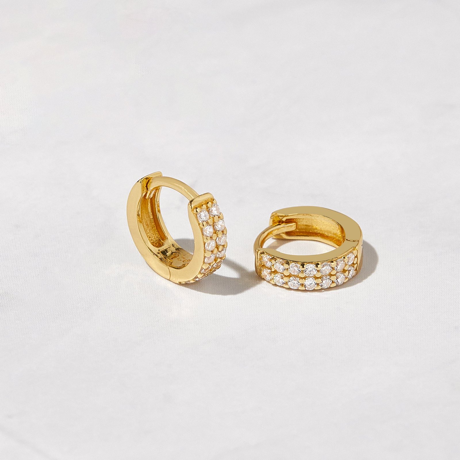 925 Silver two-row CZ huggies with 14K gold or rose gold plating, 10mm outer diameter, hypoallergenic. Versatile and sparkly. Ships in 7–8 days.