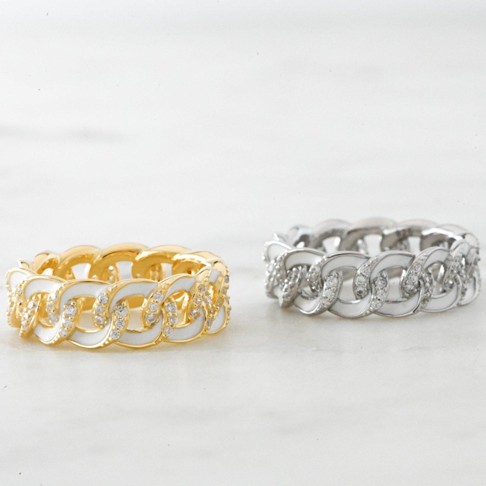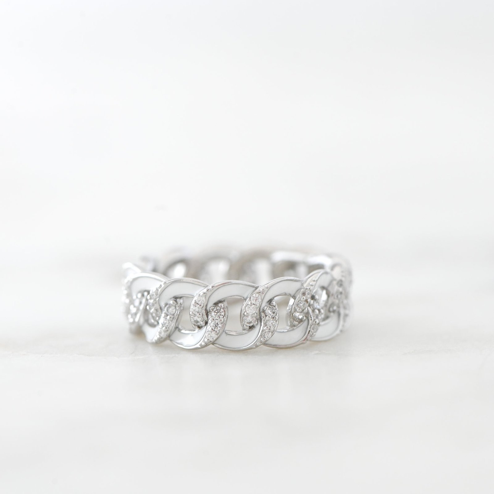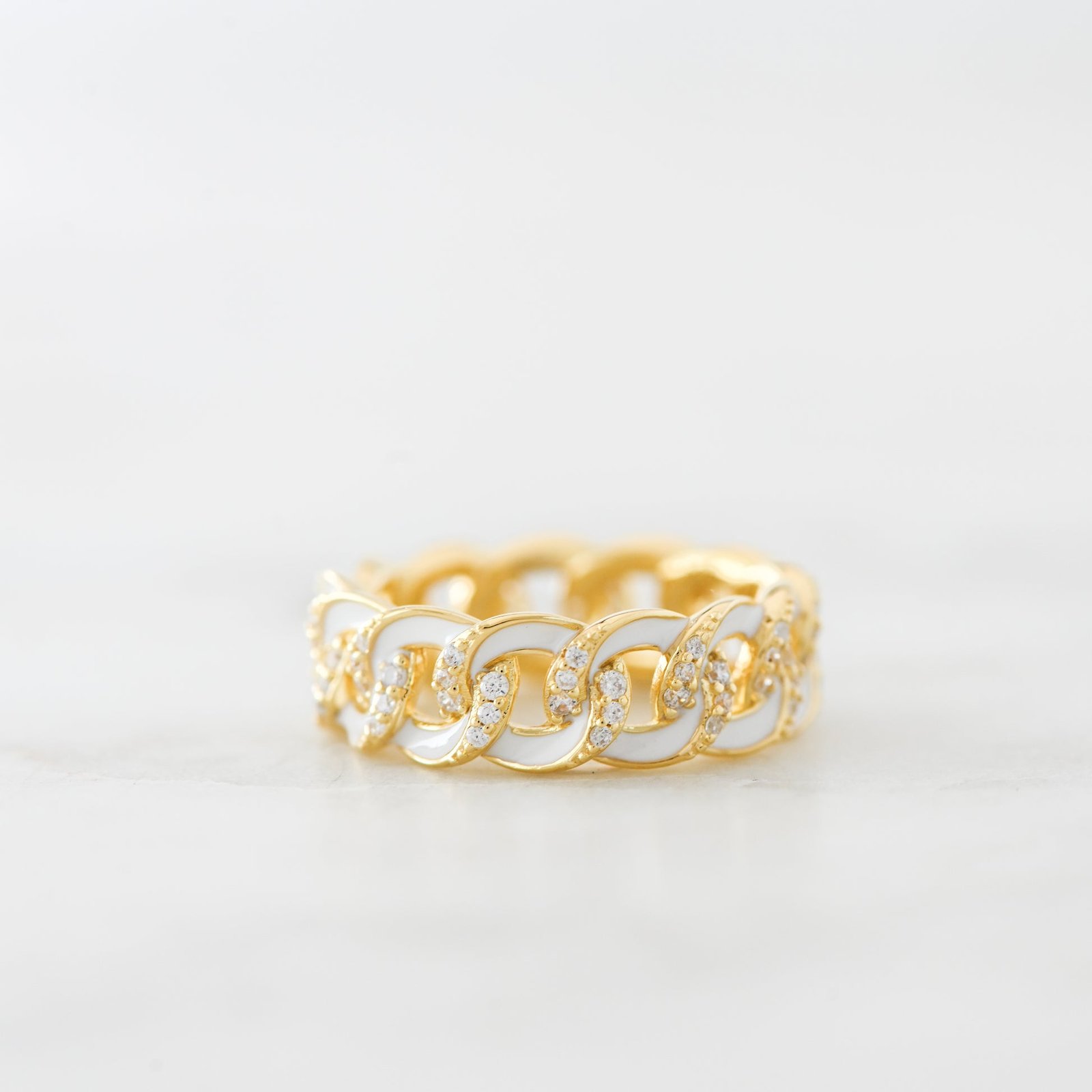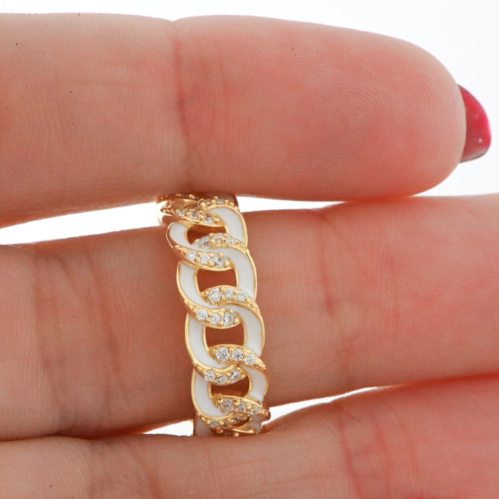 925 Silver White Enamel Chain Ring with 14K Gold Plating, highest-grade CZ, nickel-free & hypoallergenic. Width: 7mm.