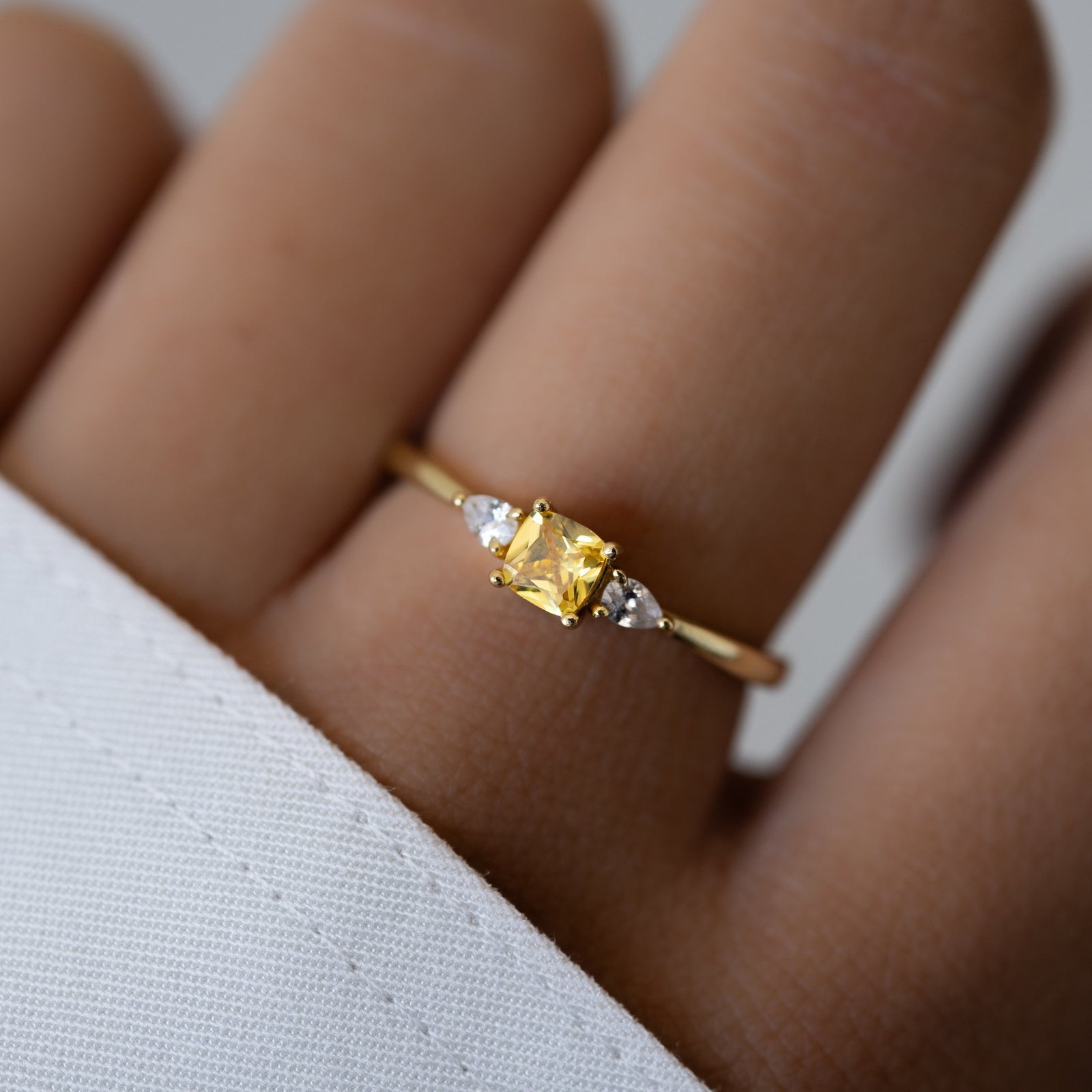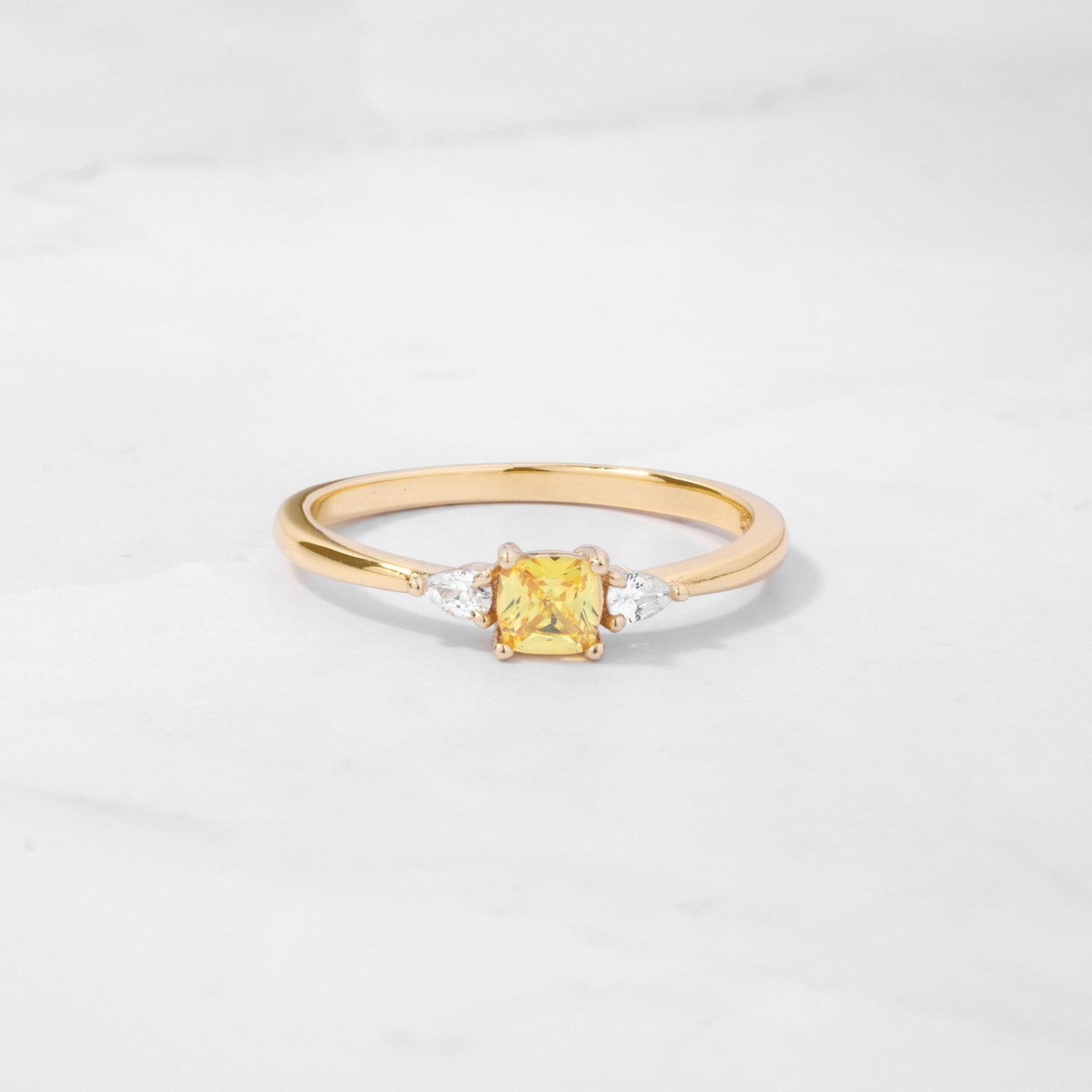 Set with the highest grade cubic zirconia, this ring provides an authentic, diamond-like sparkle that mimics the brilliance of precious stones. The cushion shape of the stone creates a classic and elegant look, perfect for any occasion. Whether worn alone for a minimalist look or stacked with other rings for a trendy feel, the Yellow Cushion Ring is versatile and stylish.