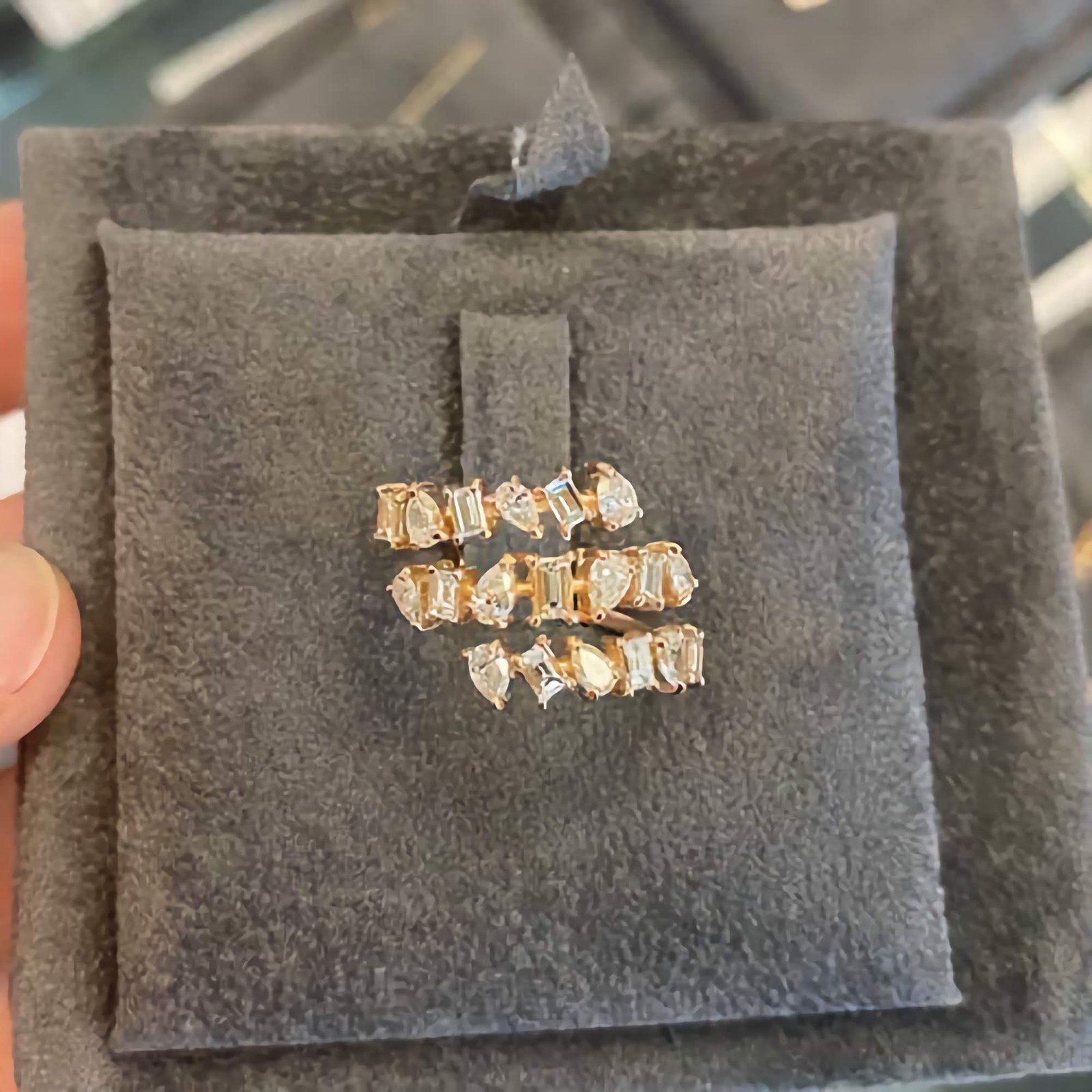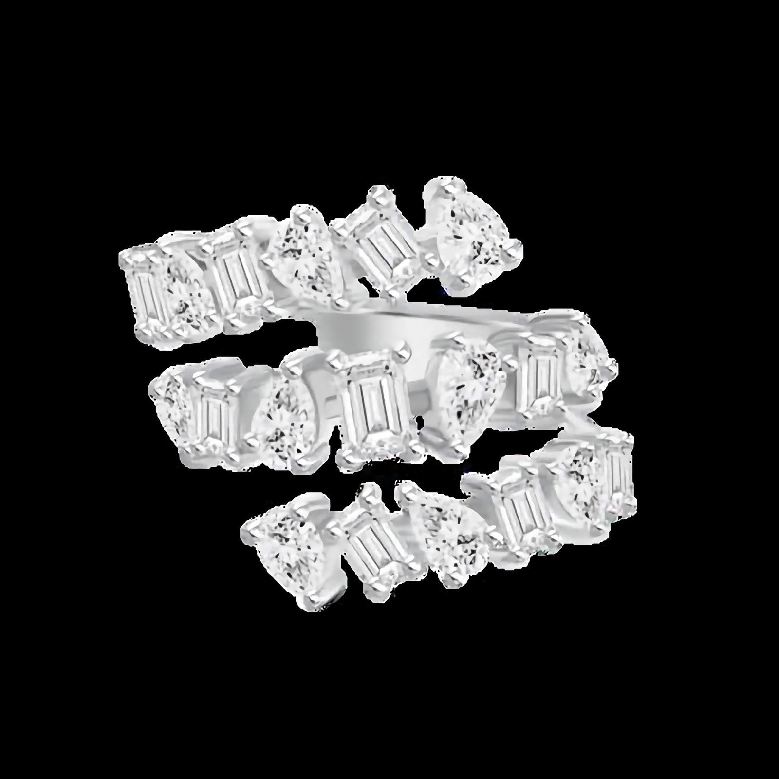 The unique triple coil design creates a stacked effect in one single ring, while multiple shapes of high-grade Cubic Zirconia—round, baguette, and pear—add dimension and eye-catching brilliance. Each stone is meticulously placed to enhance the flowing structure, offering a modern twist on traditional diamond bands.